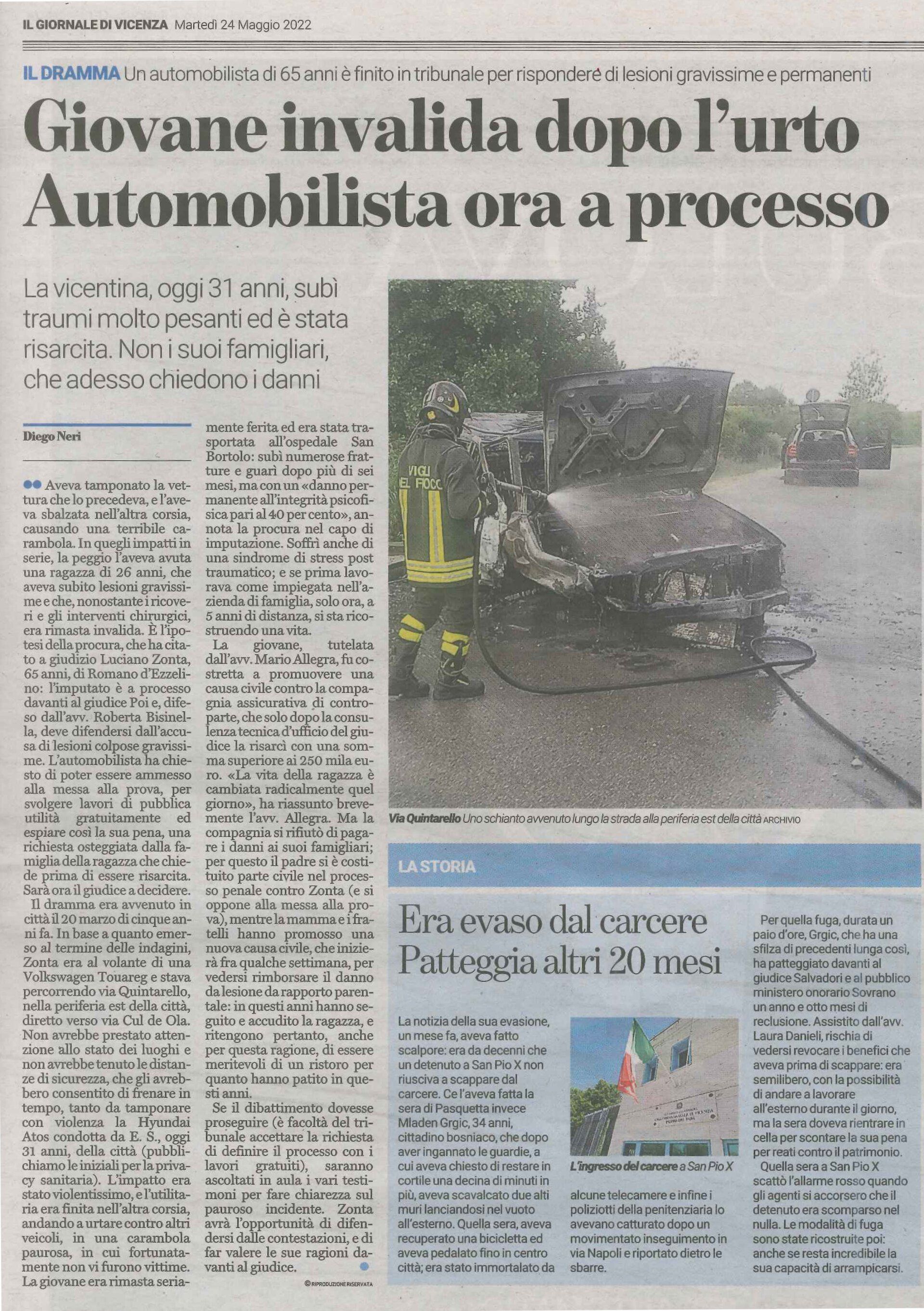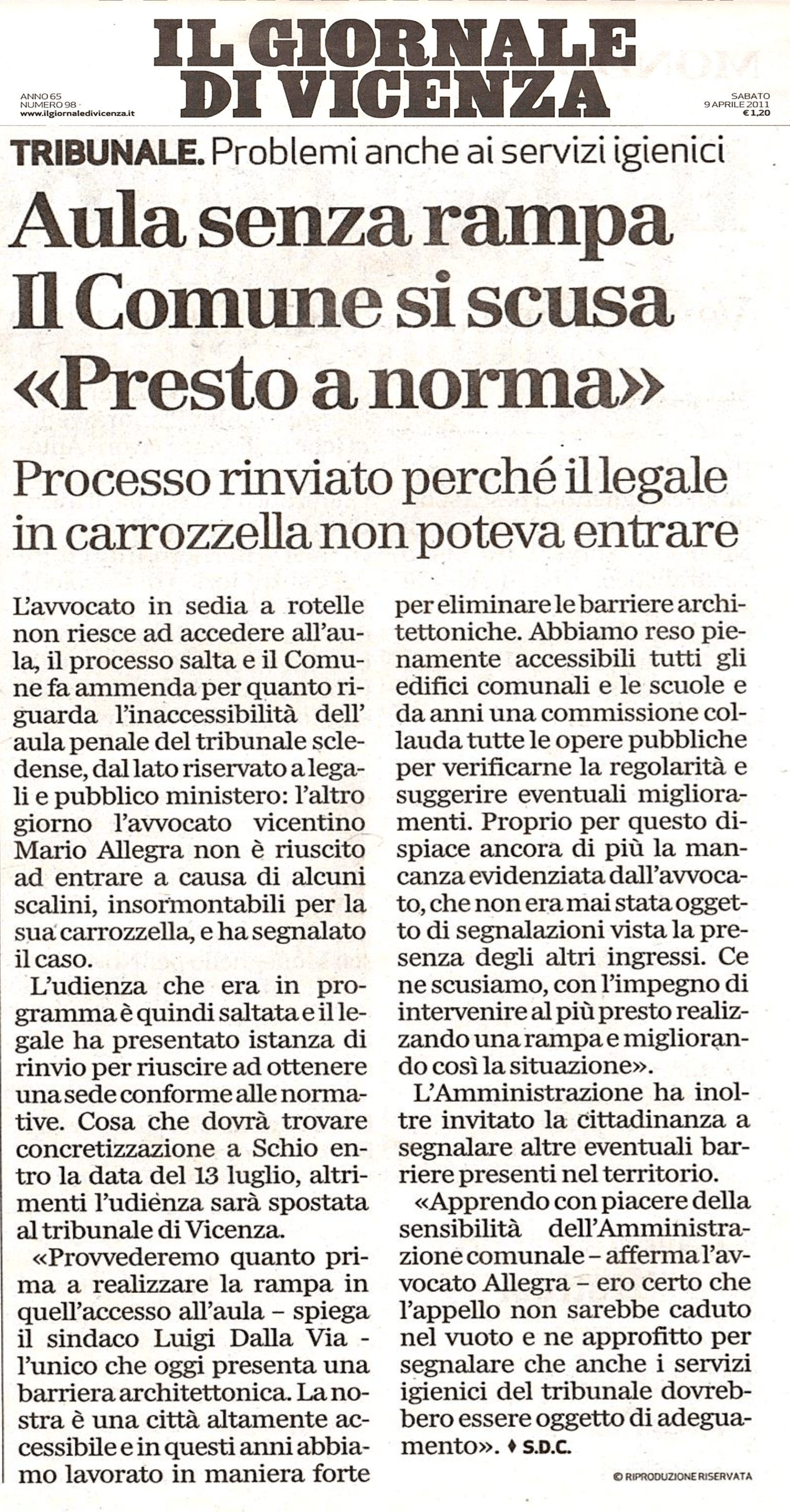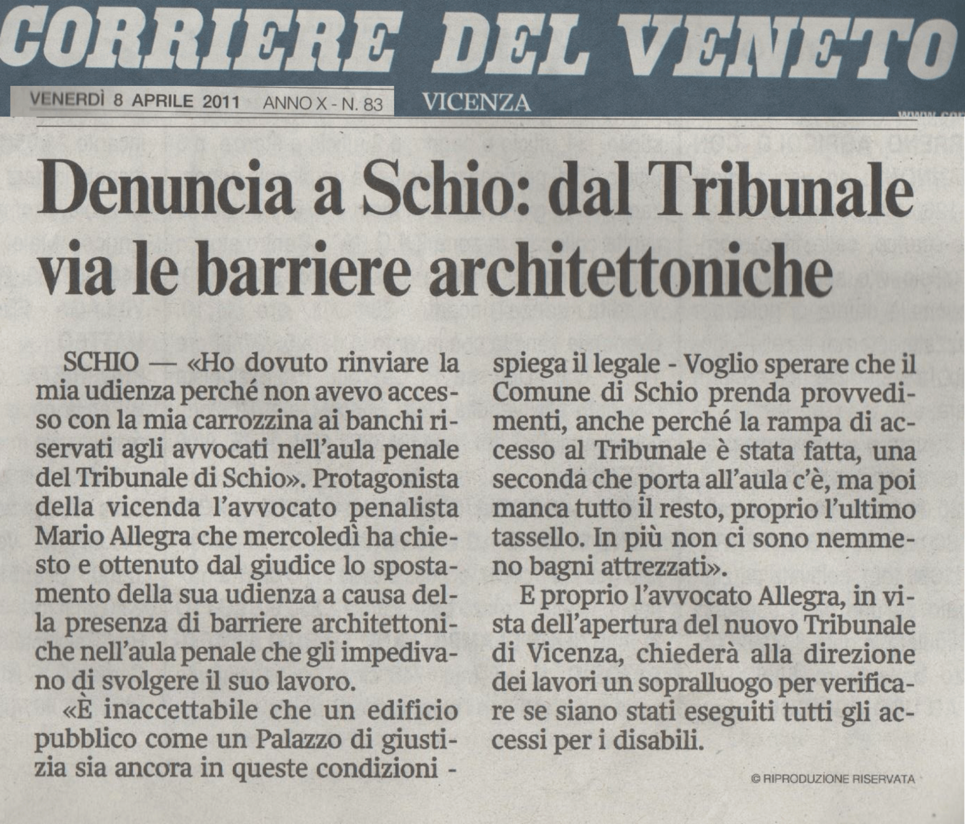 VICENZA La sede della Corte d’Appello a Venezia non è accessibile all’avvocato vicentino Mario Allegra, che ha scritto alla presidente Ines Marini per chiedere che l’udienza del 27 marzo a cui doveva essere presente per trattare il procedimento del suo cliente venga differita. A data da stabilirsi...