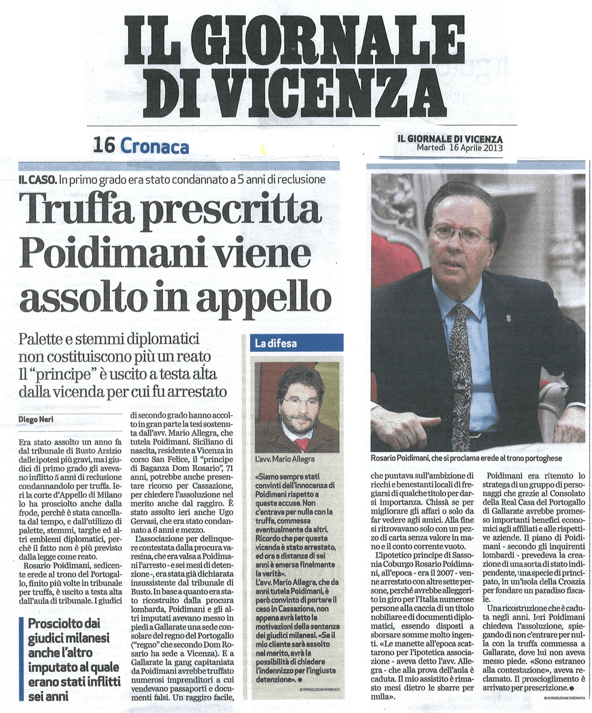 Assolto dall'accusa più grave, ma punito per altri reati. Il tribunale di Busto Arsizio ha condannato ieri a 5 anni di reclusione Rosario Poidimani, sedicente erede al trono del Portogallo...